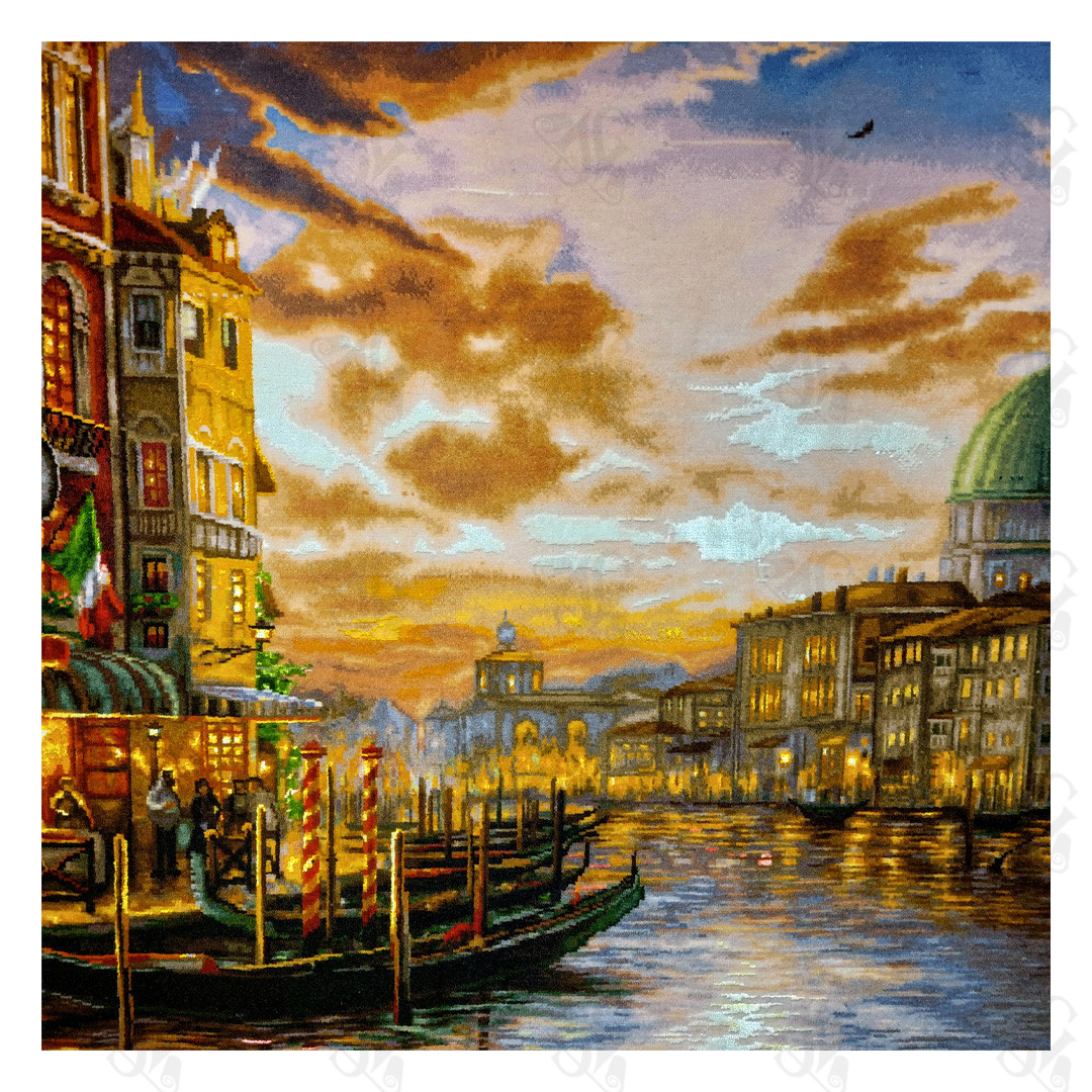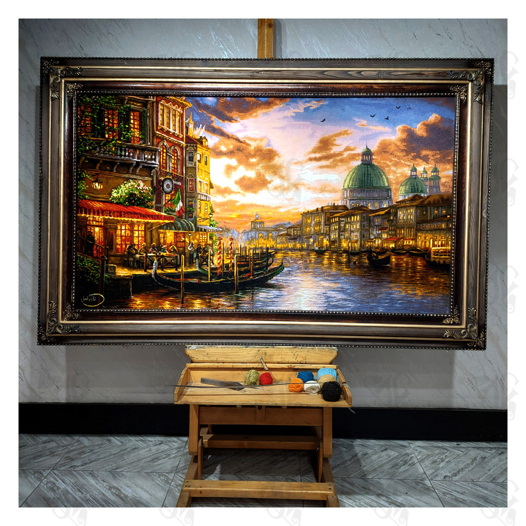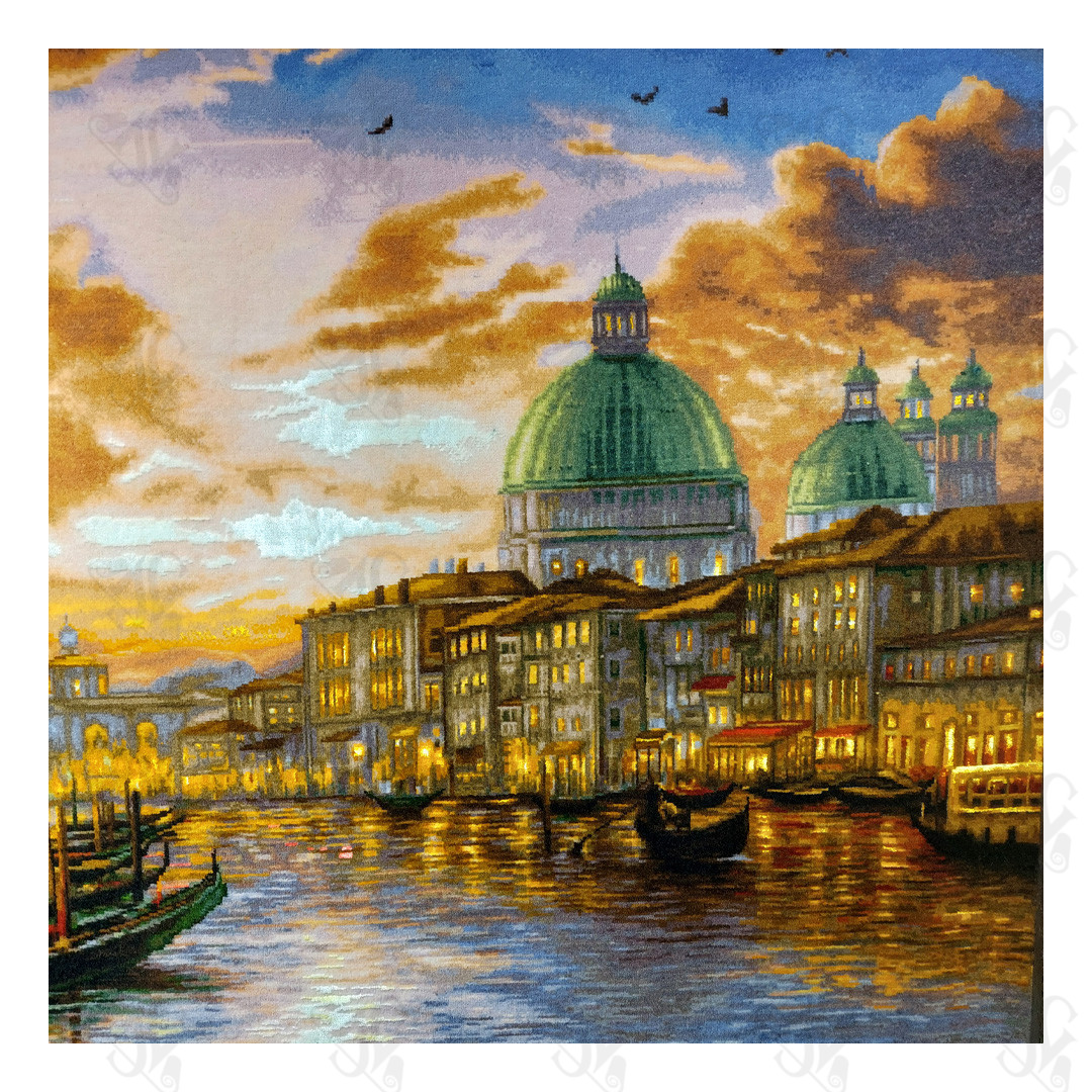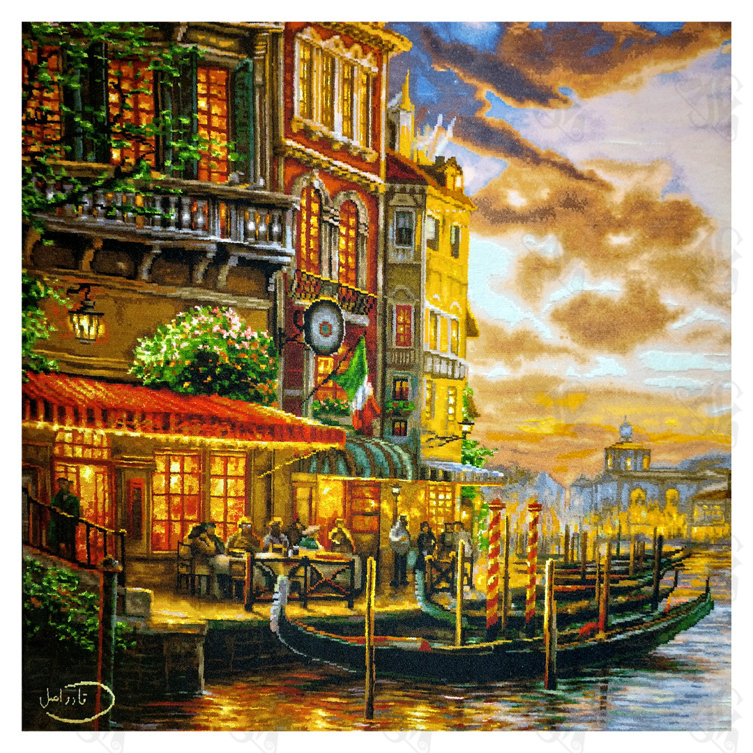 Bring the timeless romance and dramatic beauty of Italy’s floating city into your home with the Soonaz Hand-Woven Tabriz Silk Rug (Venice 5002). This spectacular pictorial rug captures a mesmerizing evening scene in Venice, where the fiery hues of the sunset reflect off the tranquil waters of the canal. The detailed weaving vividly renders the historic architecture, the soft glow of the restaurant lights, and the iconic gondolas, creating an atmosphere of warmth and old-world elegance. Woven with an incredible level of precision, this piece transports the viewer directly to the heart of Venice, making it a dramatic and luxurious statement piece for any sophisticated interior.